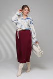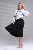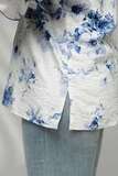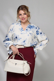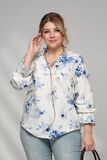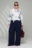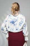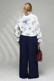 Изящная блузка, украшенная V-образным вырезом, притягивающим взгляд своей утонченностью и элегантностью. Нежные рюши на воротнике добавляют образу романтичности и женственности. Рукава с объемными оборками придают модели особый шарм и оригинальность. Центральным элементом дизайна становятся крупные цветы насыщенного синего цвета, создающие контраст с белой основой и придающие изделию особую выразительность и стиль. Эта блузка станет идеальным выбором для создания нежного, романтического образа, подчеркивающего индивидуальность и привлекательность обладательницы.