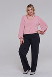 Блузка прямого кроя из мягкого струящегося материала. Круглый вырез, дополненный воротом-стойкой переходит в фигурный вырез на груди. Рукава полной длины по низу присобраны на эластичную резинку. Вытачки на груди способствуют оптимальной посадке по фигуре. Вертикальный шов, украшенный изящными пуговками, переходит по переду в небольшой разрез. Полуприлегающий силуэт блузки искусно обыгрывает фигуру и не сковывает движений. Отлично сочетается как с брюками, так и с юбками.