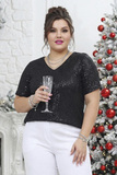 Блузка прямого кроя из мягкого эластичного материала. Модель имеет V-образный вырез с узким кантом и короткие рукава. Пайетки по всему изделию добавляют образу блеска и изящества. Полуприлегающий силуэт искусно обыгрывает фигуру и не сковывает движений. Модель легко сочетается с любым низом, поэтому скомбинировать чудесный и стильный образ с юбками, легинсами, брюками не составит труда.