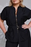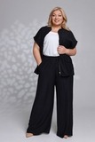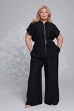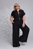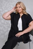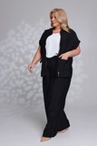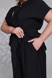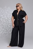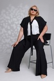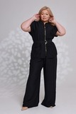 Костюм из мягкого струящегося материала состоит из удлиненной рубашки и брюк. Брюки отлично сидят за счет широкой эластичной резинки на поясе. По бокам практичные карманы. Рубашка прямого кроя с короткими приспущенными рукавами. Круглый вырез дополнен стойкой-воротником. Модель застёгивается на молнию. Небольшие разрезы по бокам обеспечивают оптимальную посадку по фигуре. Накладной карман на груди оформлен клапанами. С помощью однотонного пояса при желании можно обозначить талию. Костюм превосходно сочетается как с каблуками для создания нарядного образа, так и с кедами для более повседневного стиля. Модель также можно носить по отдельности.