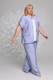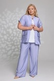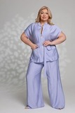 Костюм из мягкого струящегося материала состоит из удлиненной рубашки и брюк. Брюки отлично сидят за счет широкой эластичной резинки на поясе. По бокам практичные карманы. Рубашка прямого кроя с короткими приспущенными рукавами. Круглый вырез дополнен стойкой-воротником. Модель застёгивается на молнию. Небольшие разрезы по бокам обеспечивают оптимальную посадку по фигуре. Накладной карман на груди оформлен клапанами. С помощью однотонного пояса при желании можно обозначить талию. Костюм превосходно сочетается как с каблуками для создания нарядного образа, так и с кедами для более повседневного стиля. Модель также можно носить по отдельности.