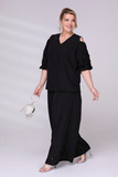 Костюм брючный с вырезом на плечах и выбитыми рисунками в цветок черный
