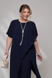 Оригинальная удлиненная туника с запАхом имеет круглый вырез и короткие цельнокроеные рукава. Ассиметричные края по бокам зрительно вытягивают силуэт и визуально стройнят. Оригинальный крой модели подойдёт как для офиса, так и для праздничных мероприятий. Элементы костюма можно также носить по отдельности.