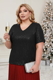 Блузка прямого кроя из мягкого эластичного материала. Модель имеет V-образный вырез с узким кантом и короткие рукава. Пайетки по всему изделию добавляют образу блеска и изящества. Полуприлегающий силуэт искусно обыгрывает фигуру и не сковывает движений. Модель легко сочетается с любым низом, поэтому скомбинировать чудесный и стильный образ с юбками, легинсами, брюками не составит труда.