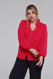 Блузка прямого кроя из мягкого струящегося материала. Круглый вырез, дополненный воротом-стойкой переходит в фигурный вырез на груди. Рукава полной длины по низу присобраны на эластичную резинку. Вытачки на груди способствуют оптимальной посадке по фигуре. Вертикальный шов, украшенный изящными пуговками, переходит по переду в небольшой разрез. Полуприлегающий силуэт блузки искусно обыгрывает фигуру и не сковывает движений. Отлично сочетается как с брюками, так и с юбками.