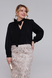 Оригинальная блузка из мягкого струящегося материала. Рукава полной длины по низу присобраны на манжет. Женственный V-образный вырез дополнен лентами-завязками, которые можно красиво завязать на шее. Небольшие складки на плечах обеспечивают оптимальную посадку по фигуре. Мягкий, приятный телу материал подарит комфорт на весь день. Вы можете комбинировать блузку как с юбками различной длины, так и с брюками и джинсами.