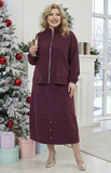 Костюм из мягкого микровельвета состоит из жакета и юбки. Материал хорошо сохраняет тепло, устойчив к деформации и практически не мнется. Юбка отлично сидит за счет эластичной резинки на поясе. По переду модель украшена декоративными пуговками.