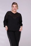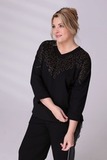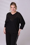 Джемпер прямого кроя из мягкого трикотажа согреет Вас в холодную погоду. Имеет V-образный вырез с небольшим кантом по краям.  Цельнокроеные рукава длиной 3/4 снизу присобраны широкой планкой.  Орнамент из страз на рукавах и на груди  добавляет модели нарядности и освежает образ. Такая универсальная модель подходит ко всему, а приятный на ощупь материал - обеспечивает комфорт и уют на весь день. Модель  отлично сочетается с брюками и юбками.