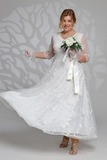 Элегантное платье из мягкой струящейся ткани - подчеркнет вашу женственность и изящность. Модель без подплечников, имеет прозрачные рукава ¾. Полуприлегающий верх идет с классическим круглым вырезом. Платье отрезное по линии талии. Вытачки на груди и по спинке обеспечивают оптимальную посадку по фигуре. Линия талии подчеркнута с помощью пояса, который можно завязать по желанию (в виде банта). Свободная юбка создает женственный силуэт и искусно обыгрывает бедра. Фатиновый верх платья в оригинальный принт добавляет модели воздушности и лёгкости. Яркий клатч и туфли на каблуках станут идеальным дополнением к нарядному образу.