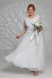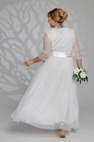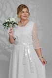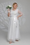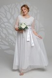 Элегантное платье из мягкой струящейся ткани - подчеркнет вашу женственность и изящность. Модель без подплечников, имеет прозрачные рукава ¾. Полуприлегающий верх идет с классическим круглым вырезом. Платье отрезное по линии талии. Вытачки на груди и по спинке обеспечивают оптимальную посадку по фигуре. Линия талии подчеркнута с помощью пояса, который можно завязать по желанию (в виде банта). Свободная юбка создает женственный силуэт и искусно обыгрывает бедра. Фатиновый верх платья с флоковым напылением в оригинальный принт добавляет модели воздушности и лёгкости. Яркий клатч и туфли на каблуках станут идеальным дополнением к нарядному образу.